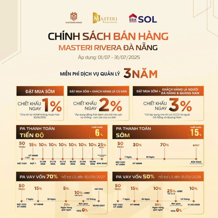 Dự án Masteri Rivera Đà Nẵng là dự án khởi đầu của chủ đầu tư tại thành phố biển Đà Nẵng, do đó Masteri Rivera nhận được rất nhiều ưu đãi đặc quyền từ chủ đầu tư: Chiết khấu lên đến 18%, Miễn phí quản lý đến 36 tháng, Hỗ trợ vay an cư sống khỏe với gói hỗ trợ đến 70% giá trị căn hộ, Ân hạn lãi gốc đến 24 tháng kể từ ngày giải ngân….